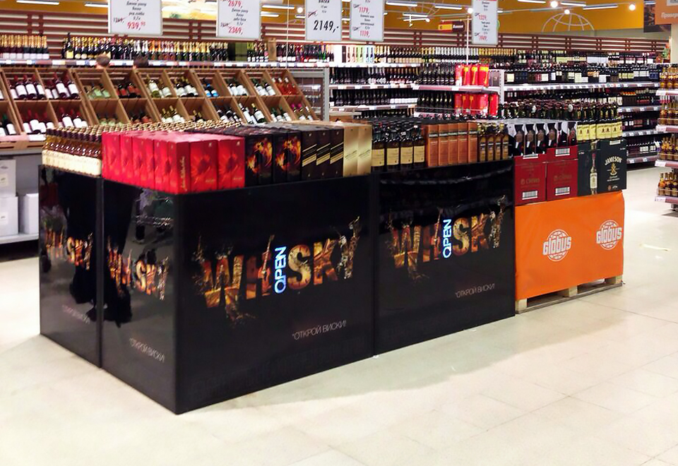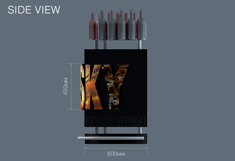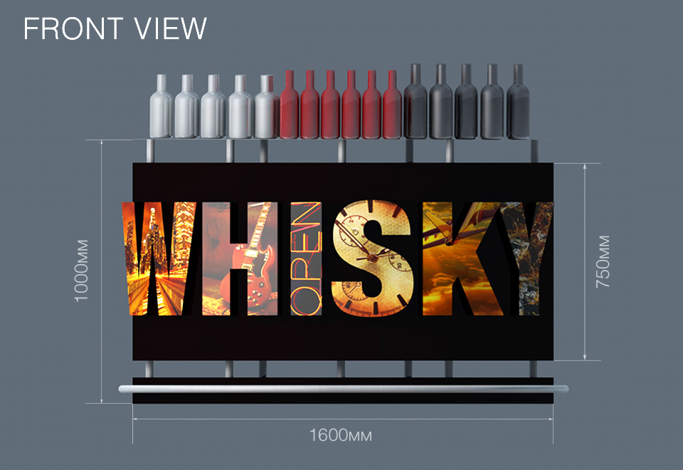 To develop the Non-standard Displays I needed more time and creativity. The main idea was to create the eye-catching and outstanding shape of the pallet. It was not enough to place the Key Visual, I needed to visualize the Key Visual. So it was: The Pallet Display with a convex shape and volumetric light letters. On top, there was a glass shelf for placing the bottles.